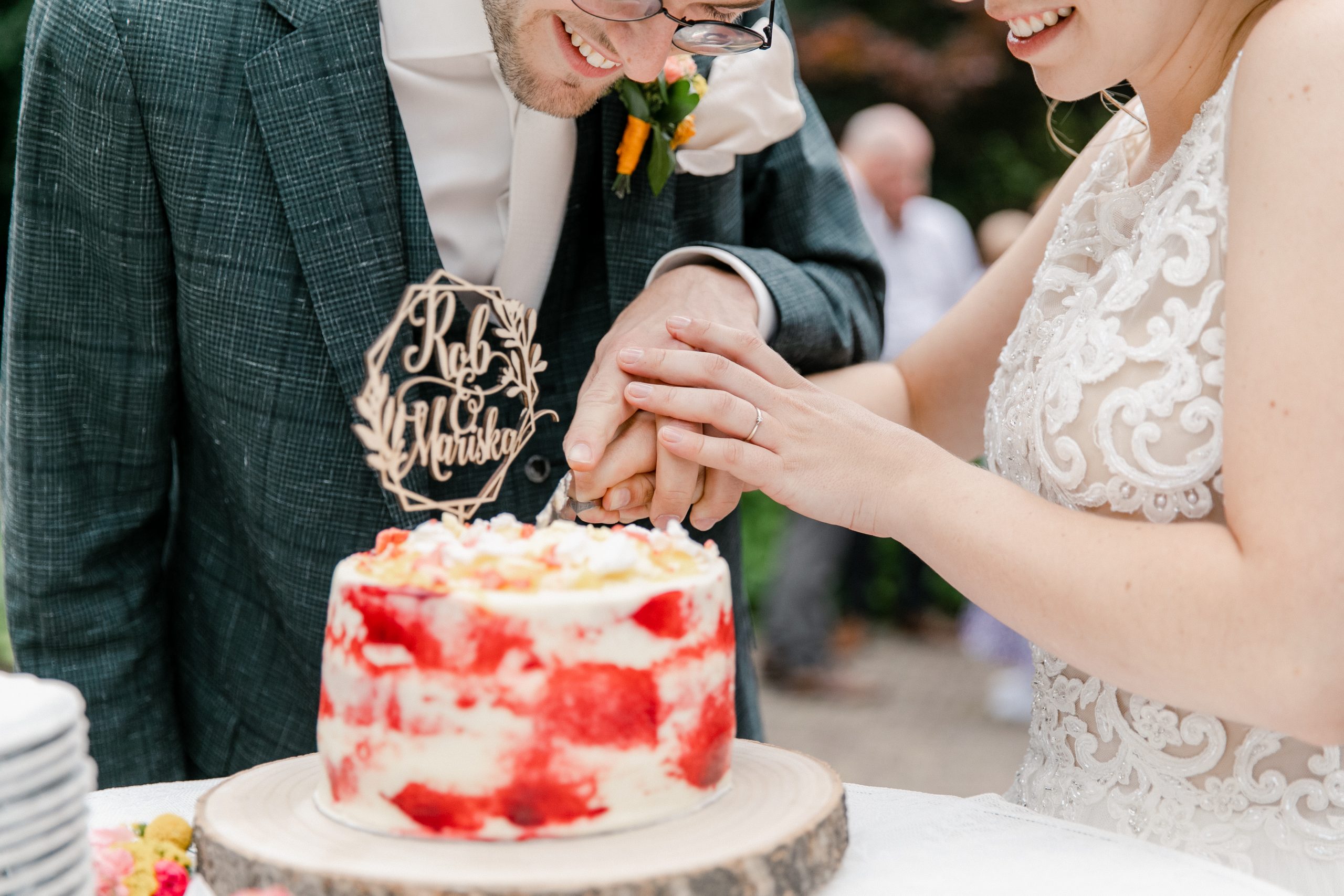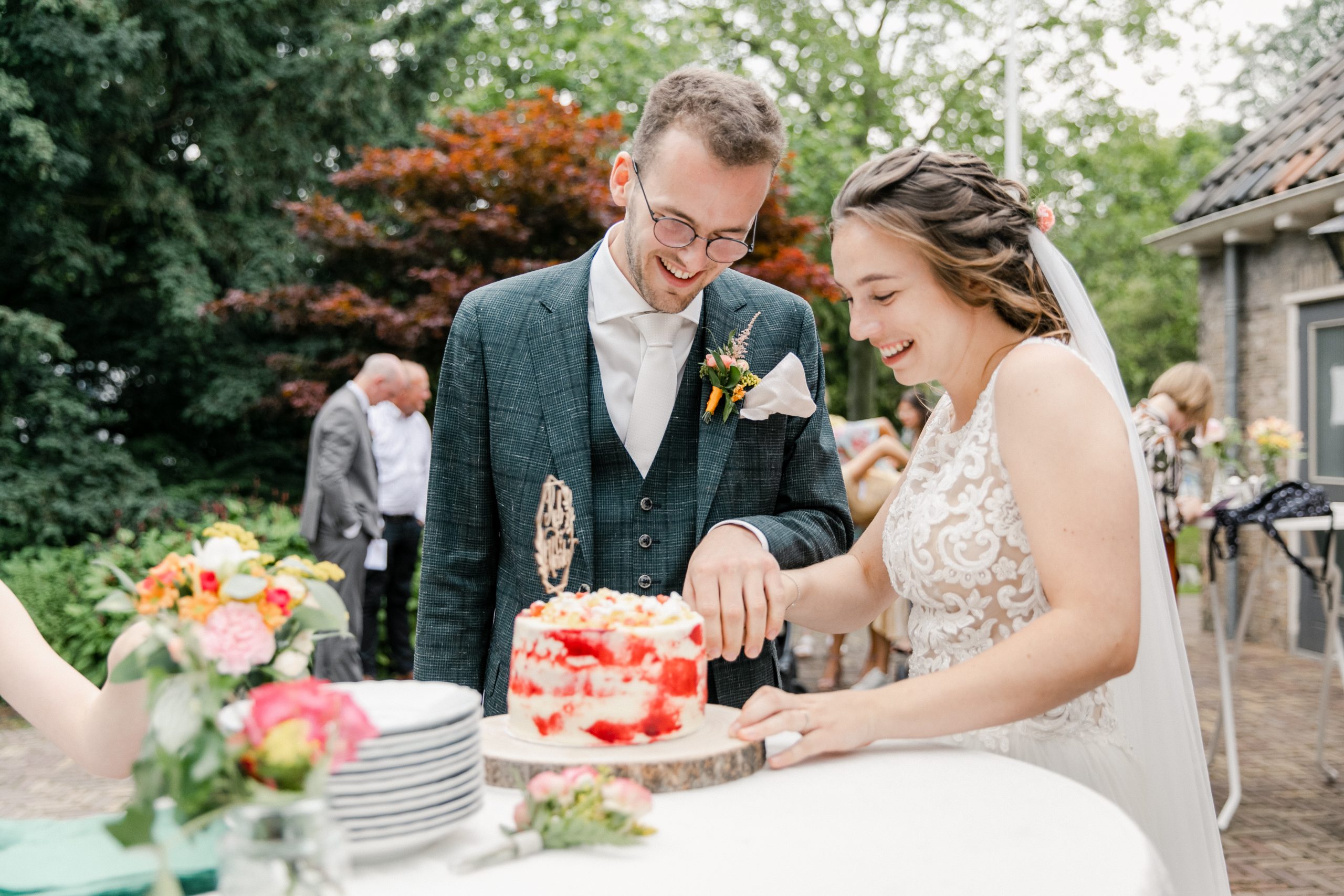 Als ik, Mariska, cupcakes bak voor andermans bruiloft, kan natuurlijk onze eigen bruiloft niet achter blijven. Zo maakte ik voor elke gast een heerlijke cupcake in verschillende smaken. Zo kon iedereen zelf kiezen wat hij of zij lekker vond. En wat stond het leuk op tafel! Zelf sneden we ‘ook’ nog een bruidstaart aan ![]()